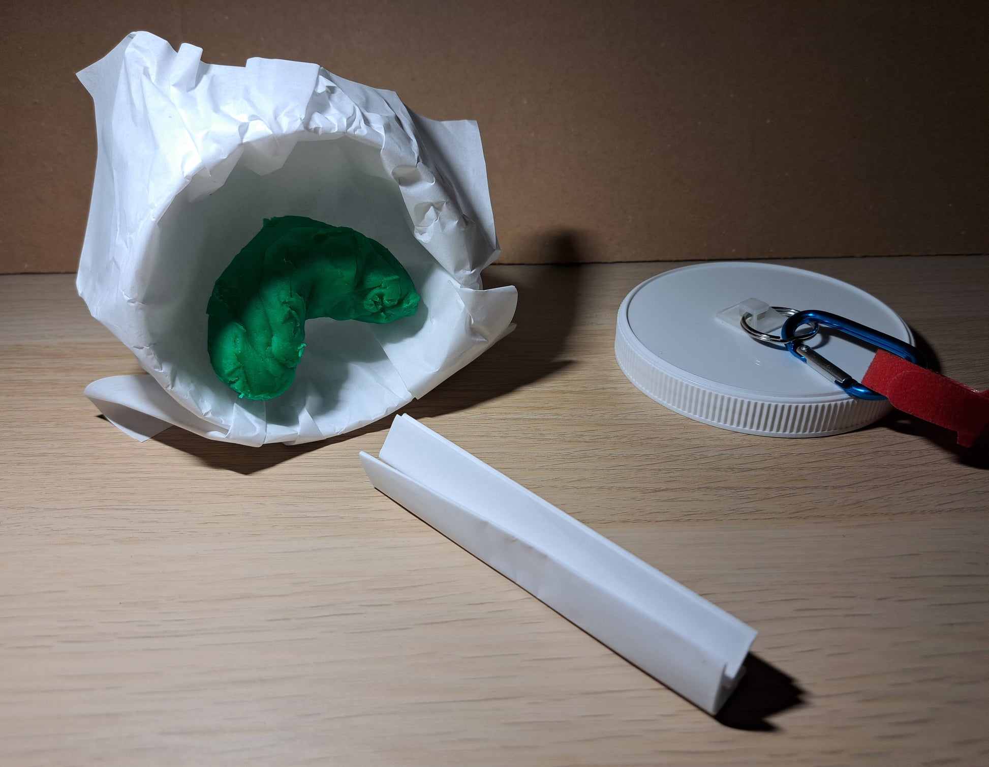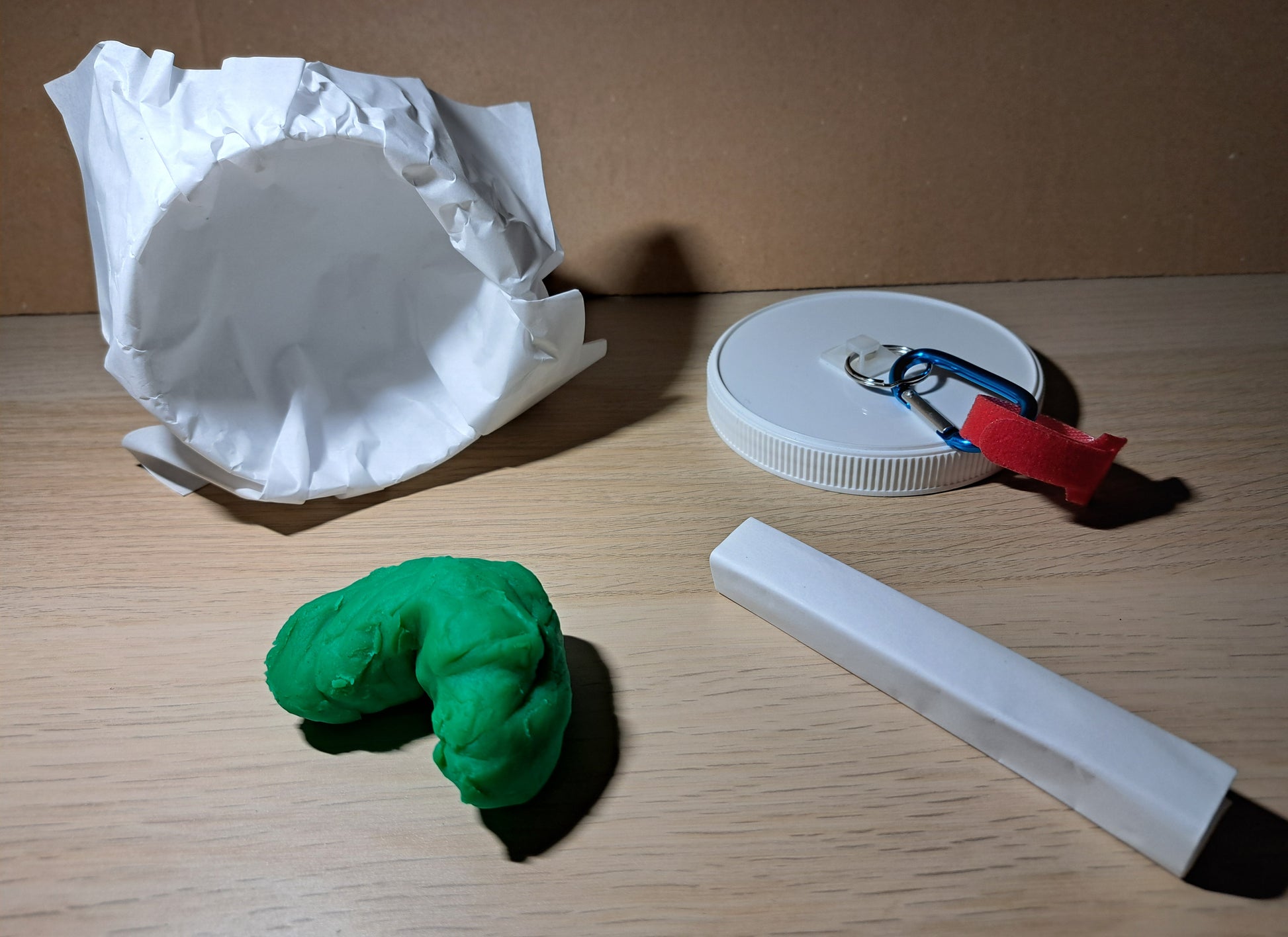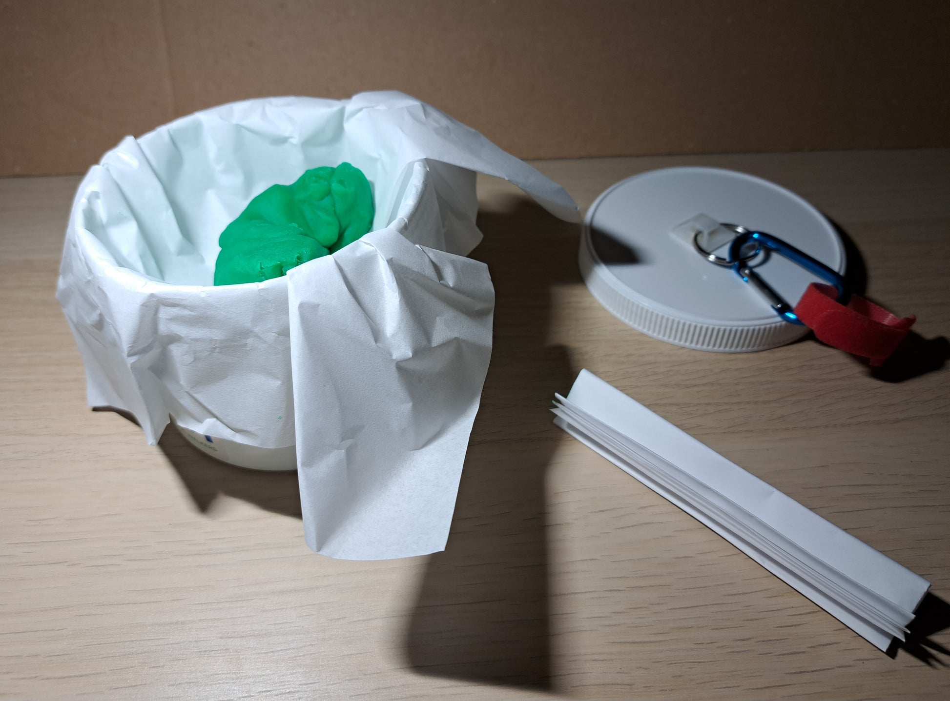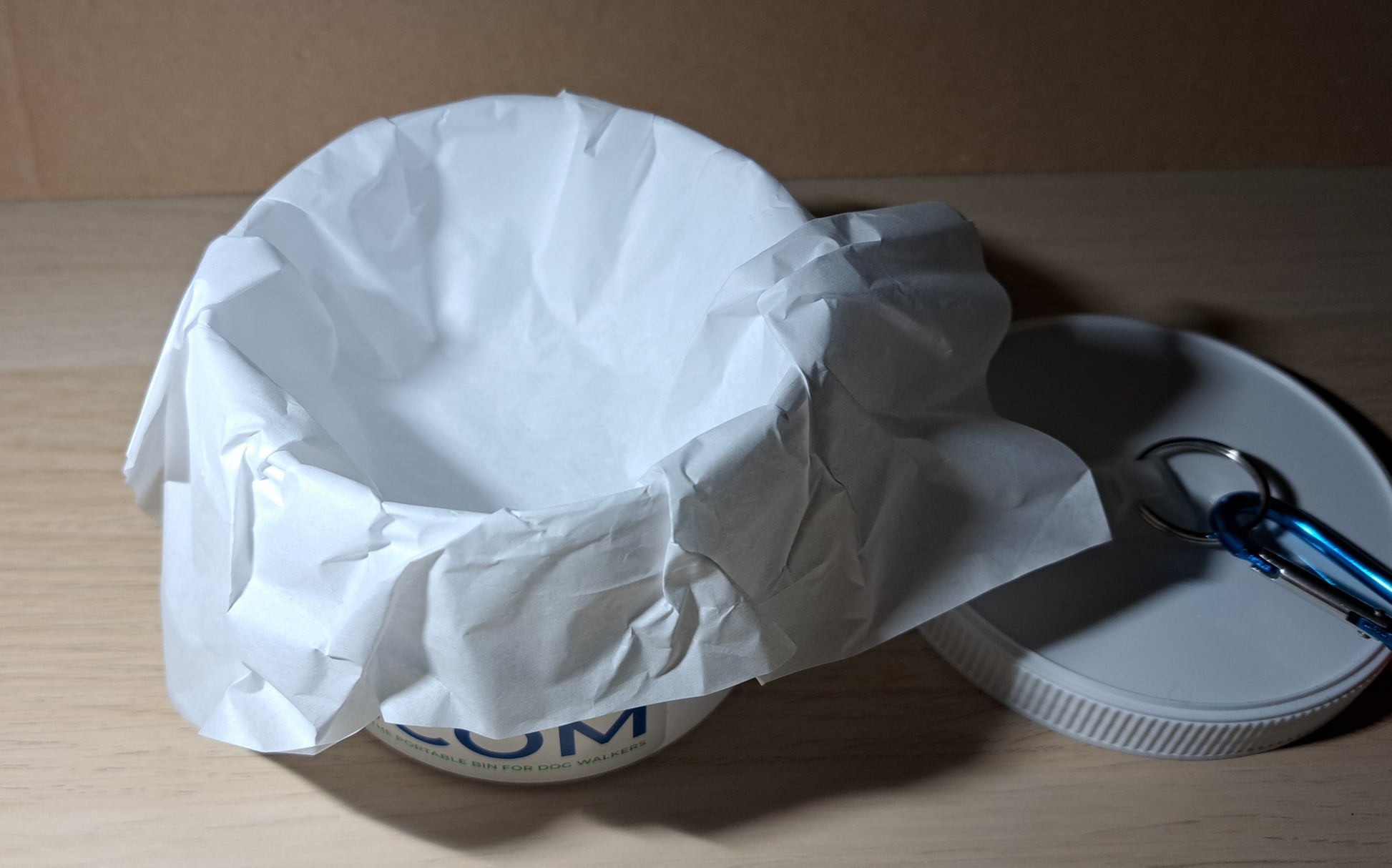 A plastic container with screw top lid and carabiner clip. For used Dog poop bags, so you don't have to carry them. Seals tightly shut. No smell or leaks. Just put the used bag in the jar and clip onto Dog collar or leash.