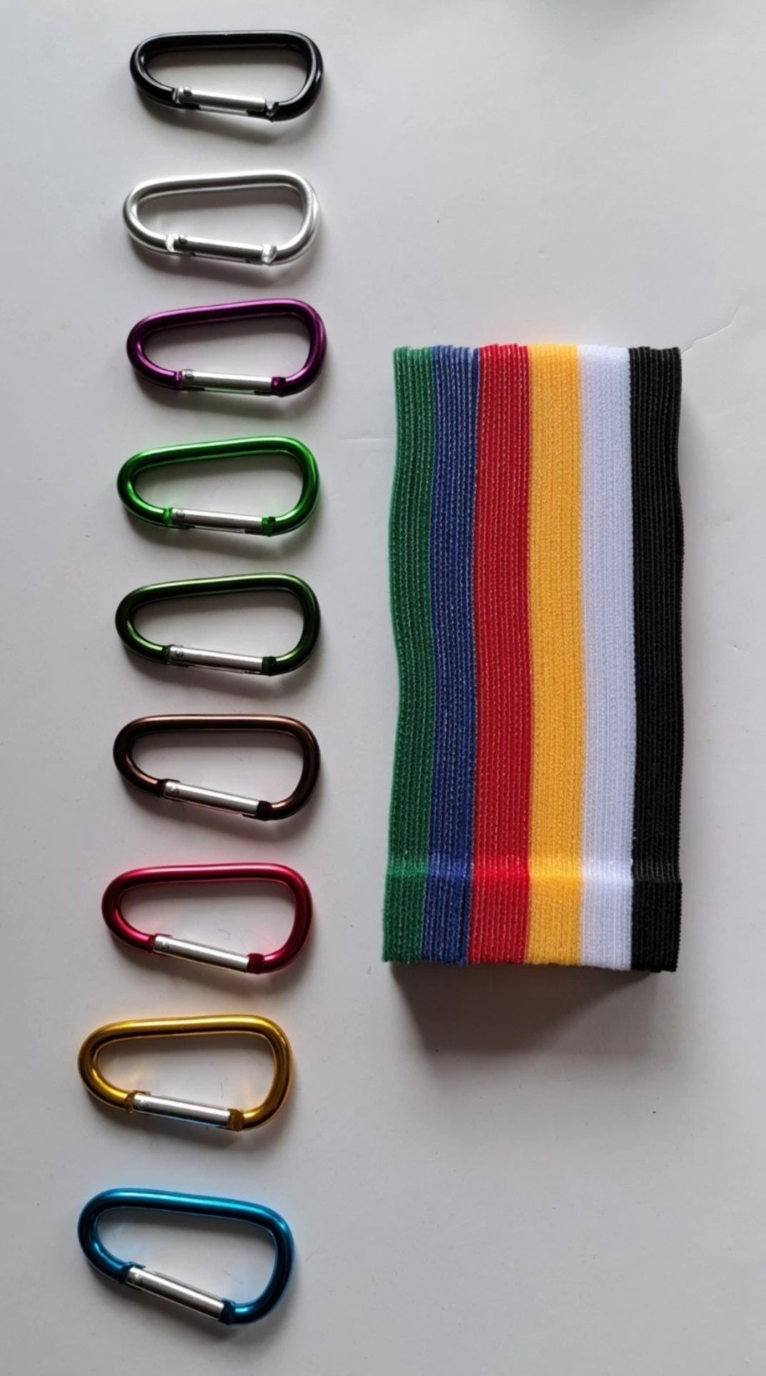 Carabiner clips and velcro straps come in different colours and are random, if you want a specific colour, just mention it with your order. Thanks.